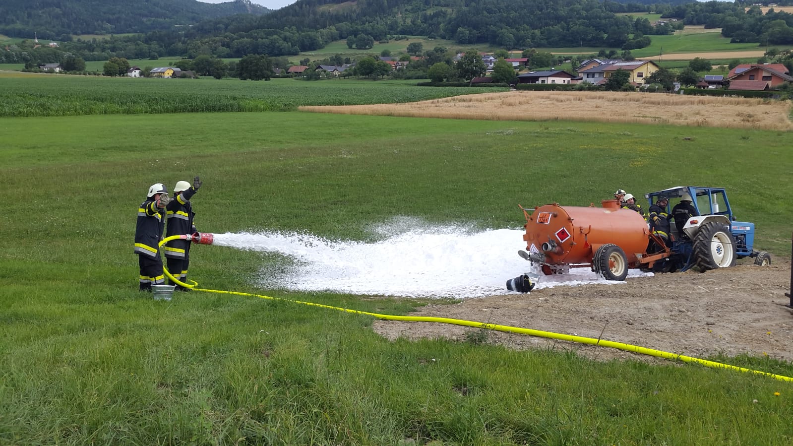 Umgehend wurde mit dem Brandschutz begonnen, um eine sichere Personenrettung zu gewährleisten. Das KLF sperrte in der Zwischenzeit den Bereich großräumig ab. Nachdem großflächig ein Schaumteppich errichtet war, konnte mit der sicheren Personenrettung begonnen werden. Der Tank wurde abgedichtet, um weiteres austreten zu verhindern!